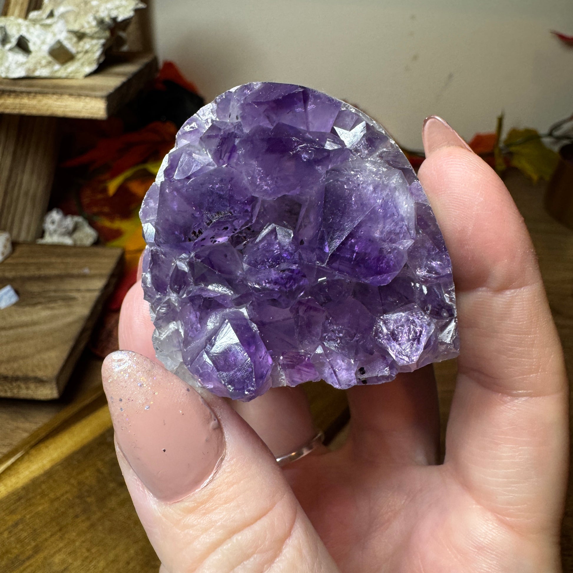 The faces of the crystal points flash with every movement, catching the light in a way that feels almost ethereal like amethyst poured over ice. The natural banding at the base, with swirls of grey and soft browns, adds grounding texture and highlights the raw beauty of the cluster’s untouched sides.