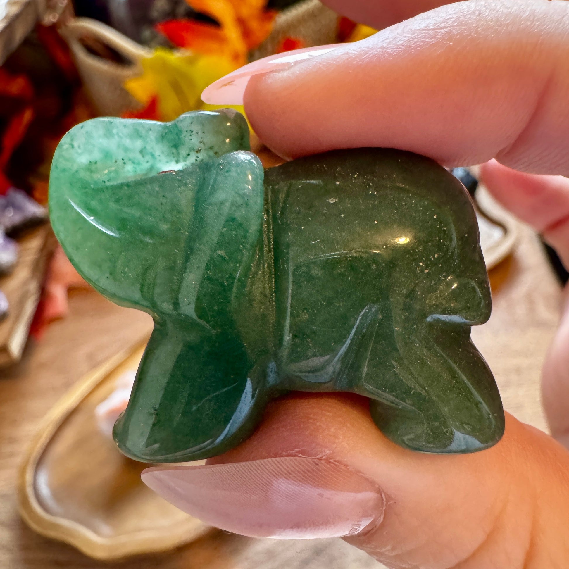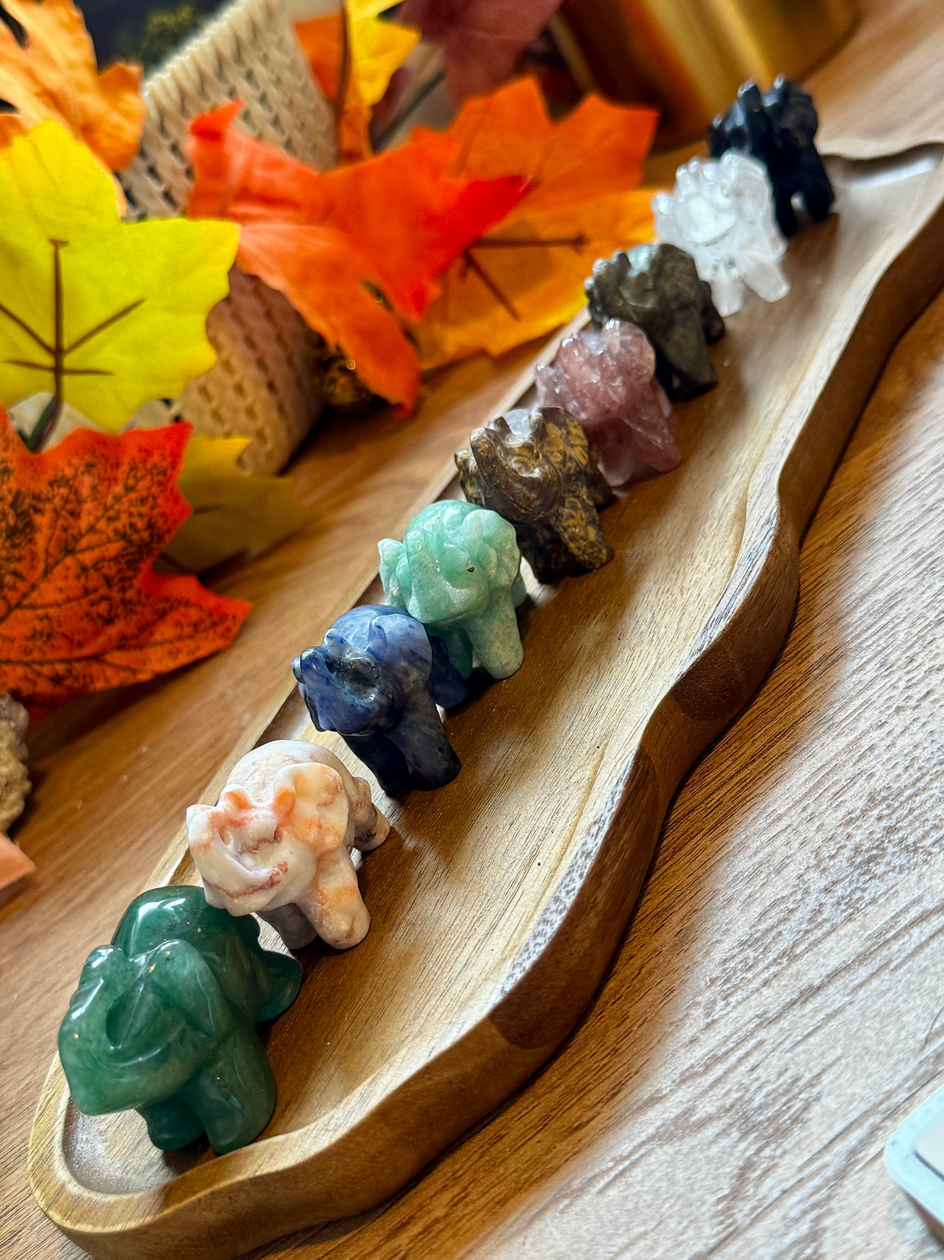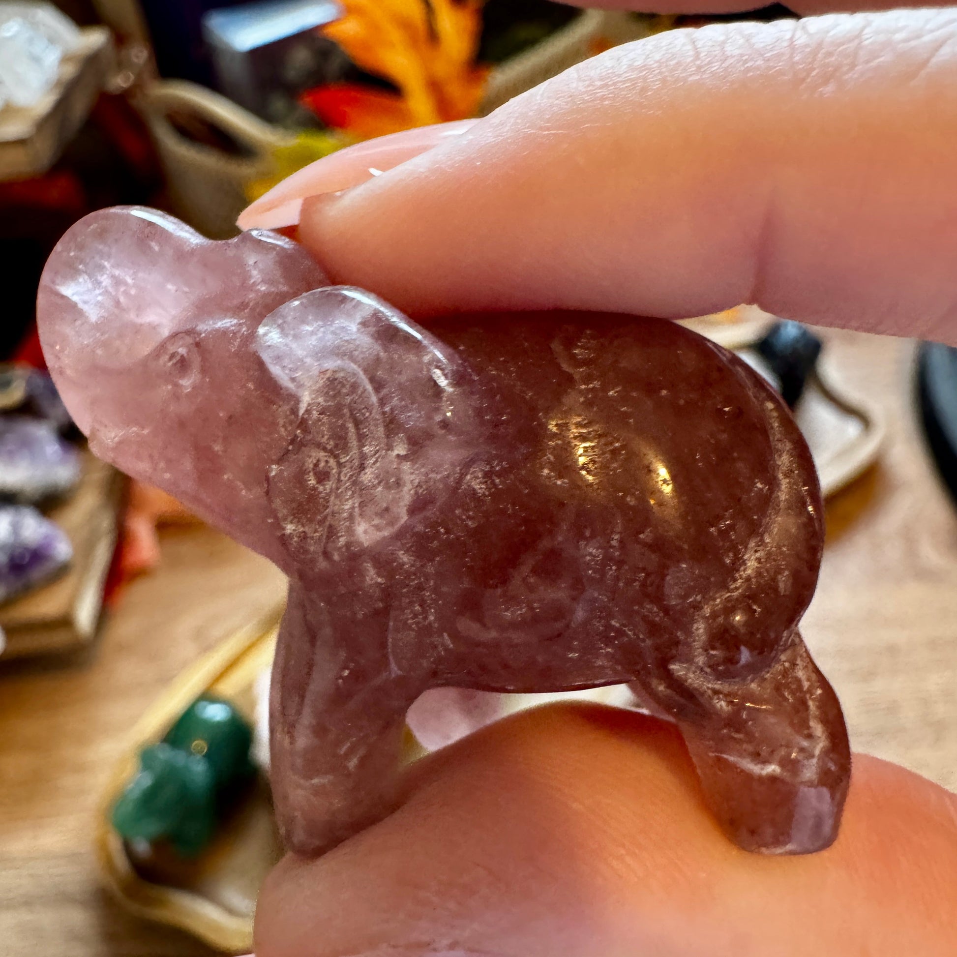 These hand-carved crystal elephants measure approximately 4 cm by 3 cm, small enough to sit comfortably on your shelf, altar, or desk but detailed enough to show off each crystal’s natural texture and colour. Whether it's the rich blue of sodalite, the soft pink of strawberry quartz, or the grounding green of aventurine, each elephant has its own unique markings and energy.