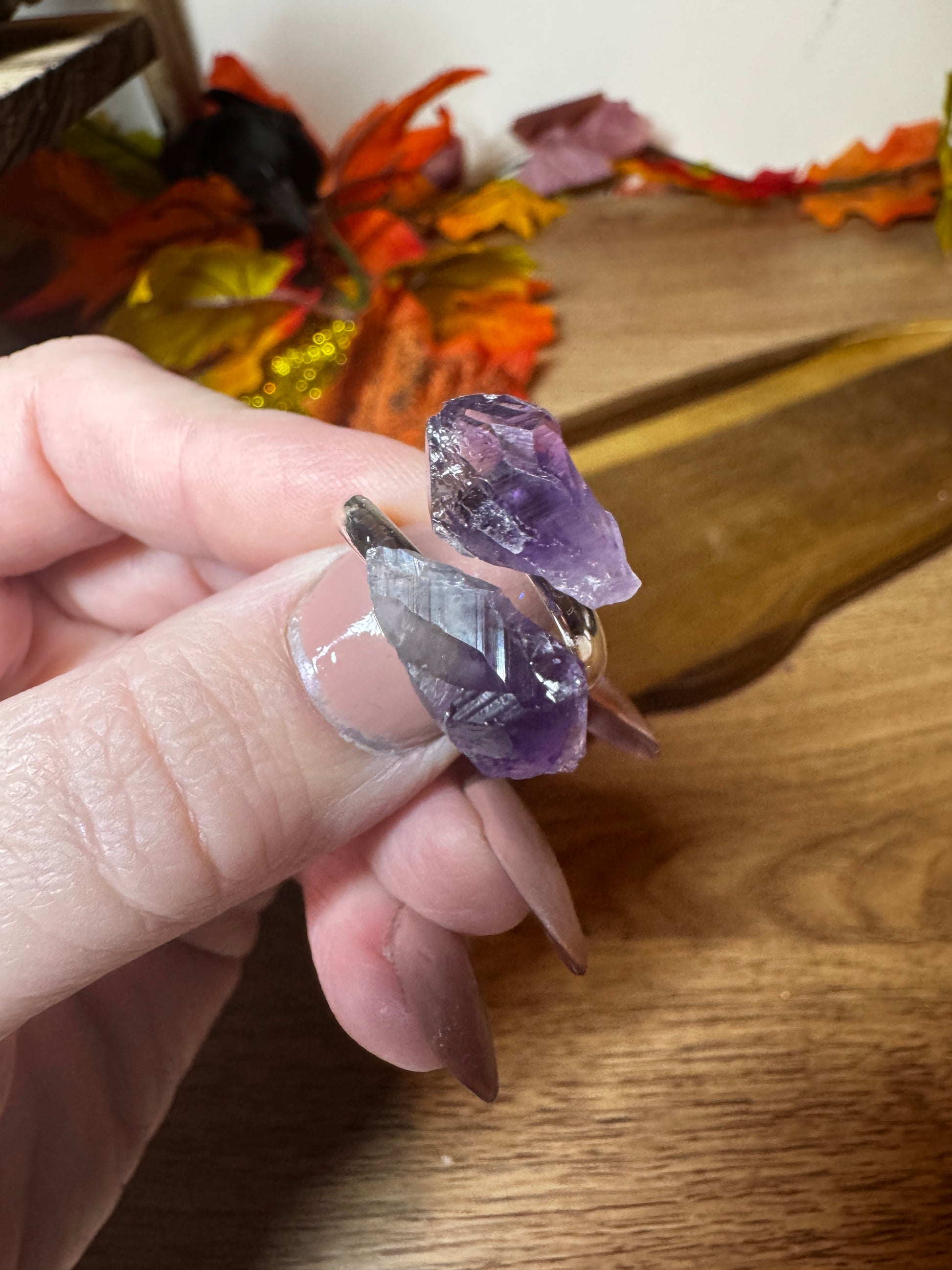 A bold statement piece crafted with two raw amethyst points, this open silver-plated ring wraps elegantly around the finger. The deep purple hues catch the light beautifully, and the natural, unpolished texture gives it a raw charm. The open style is designed to be gently adjustable, allowing for a comfortable fit across a range of sizes. Each ring is unique in crystal formation, but all are hand selected for their quality and visual appeal.