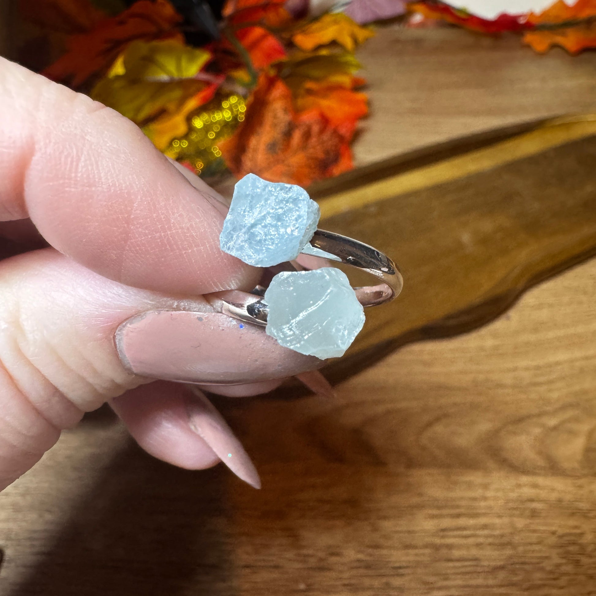 A graceful yet eye catching ring featuring a natural aquamarine gemstone set into an adjustable silver‑plated band. The band is crafted from a copper & steel base behind the plating, giving the piece both resilience and style. The cool blue tones of the aquamarine contrast beautifully with the polished silver finish, making it a perfect accessory for both everyday wear and special occasions. The adjustable open ring style ensures a comfortable fit across a range of finger sizes. This is a one of a kind piece in terms of stone pattern and colour, each ring will vary slightly in the aquamarine’s natural inclusions and tone, which is part of its organic charm.